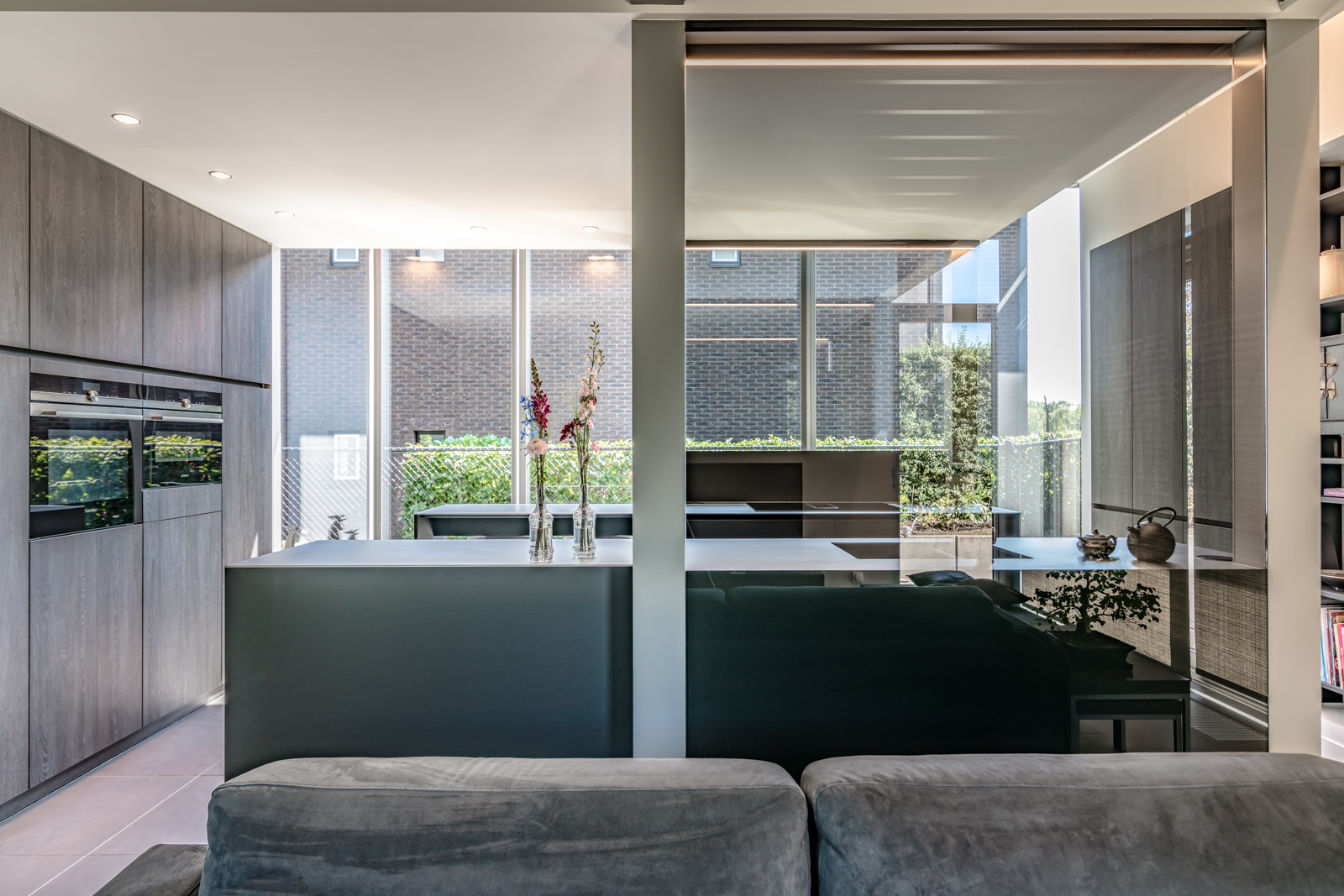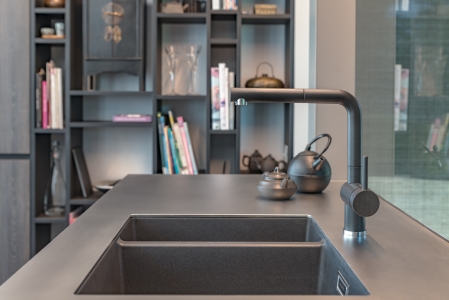 Het spoeleiland scheidt de leefruimte van de keuken. Om de openheid van de woning te behouden werken we aan de spoelbak met een glazen spatwand.