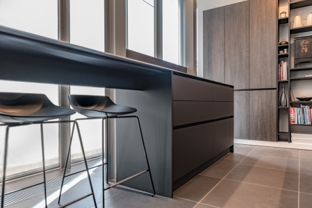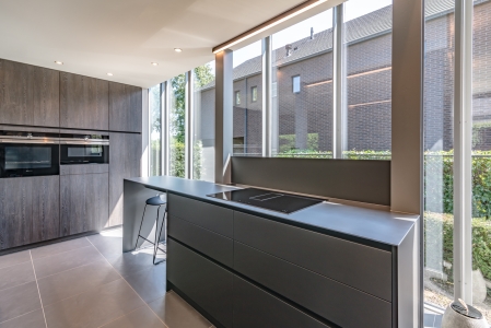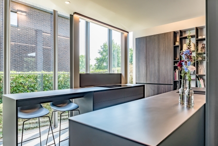 Tegenover het spoeleiland plaatsen we het kookeiland, met inductiekookplaat en geïntegreerde dampkap. Omdat het kookeiland een beperkte diepte heeft, plaatsen we achter de kookplaat een spatwand in hetzelfde materiaal als het werktablet. In het verlengde van het kookeiland verwerken we een ontbijthoekje op krukjes, zo kan de werkbladhoogte blijven doorlopen. Beide eilanden voorzien we van een maximum aan opbergruimte. De materialen die we gebruiken in de eilanden zijn geïnspireerd op de metalen structuur van het huis. Zwarte onderkastjes gecombineerd met een RVS tablet geven het geheel een stoere en industriële uitstraling.
