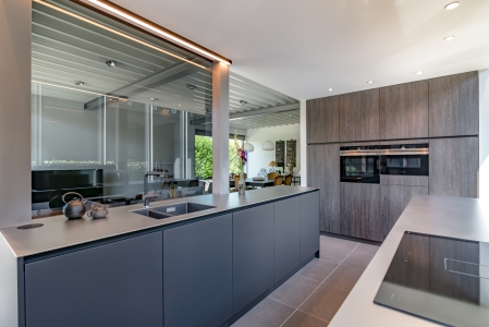 De toestellen zijn gegroepeerd in een hoge kastenwand. Boven en onder de toestellen is er nog opbergruimte. Aan de overzijde komt de hoge kastenwand deels terug, deze is net diep genoeg om het servies op te bergen. Naast de servieskast plaatsen we een open boeken- en decoratierek. De hoge kastenwanden zijn gemaakt in een houtlook laminaat om het geheel een warme en gezellige toets te geven.